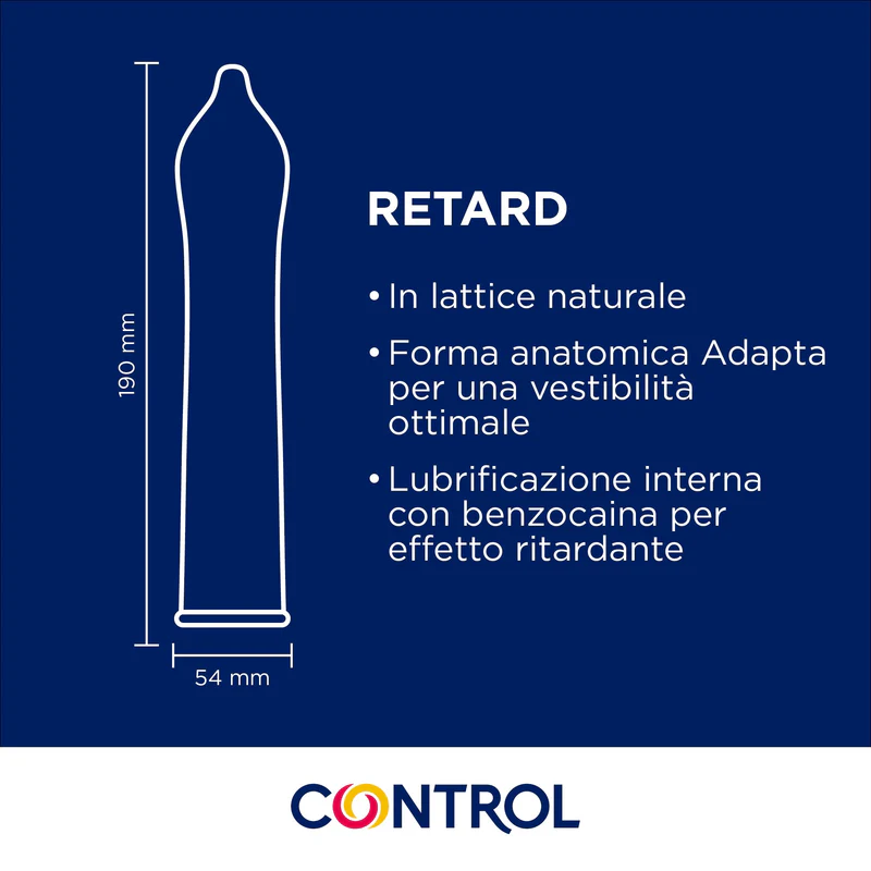 Control Retard: preservativi ritardanti con 4,5% di benzocaina. Aiutano a prolungare il rapporto e ridurre l’eiaculazione precoce. Comfort e sicurezza garantiti.